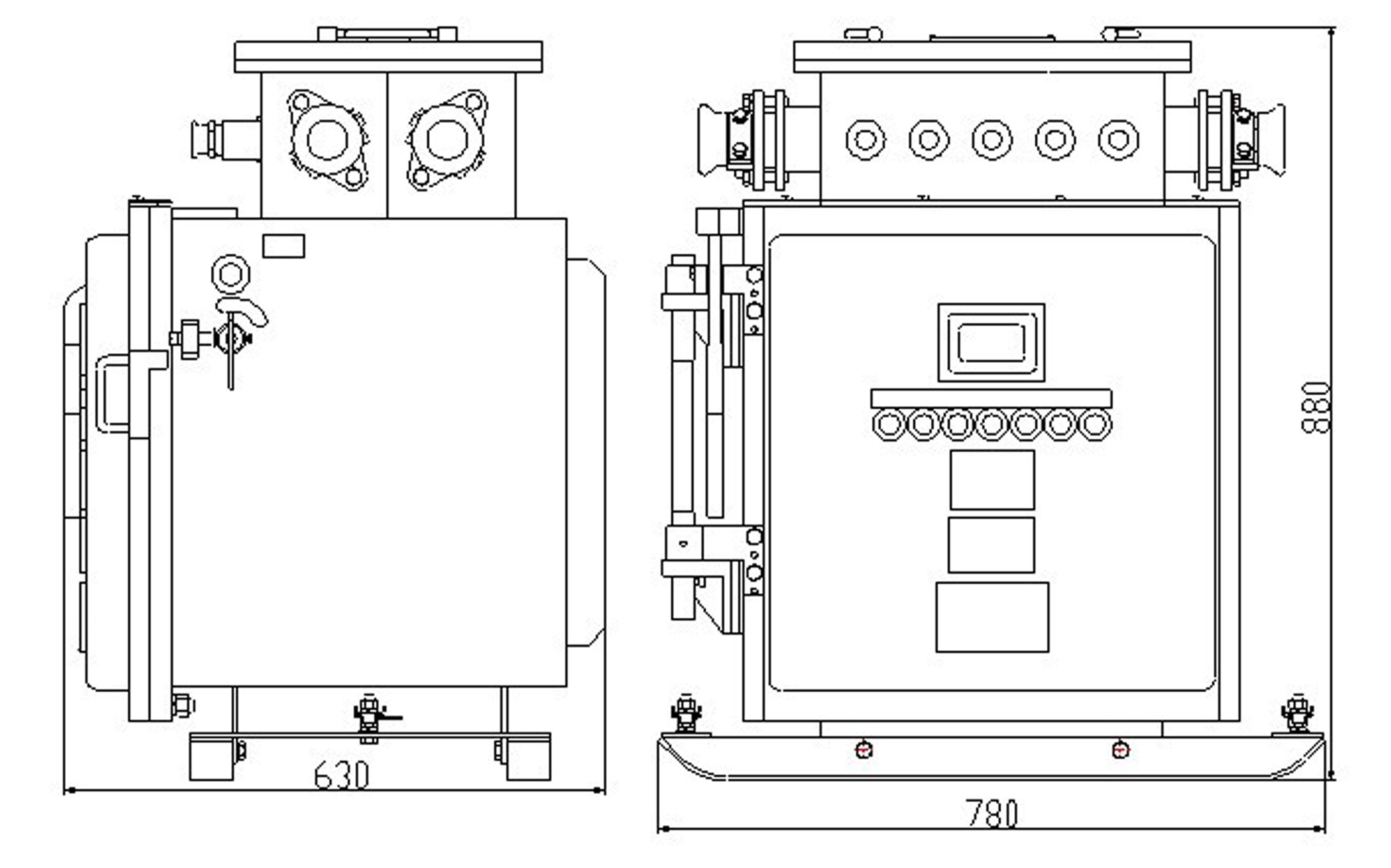 綜合裝置由隔爆外殼、主變壓器和控制部分等組成。隔爆外殼為方形,殼蓋與殼身采用滑動止口結(jié)構(gòu),開啟方便。外殼上部的接線箱作為引進(jìn)和引出電纜用,外殼右側(cè)裝有操作組合開關(guān)的手柄,并有可靠的機(jī)械聯(lián)鎖裝置,門蓋上裝有控制按鈕和試驗(yàn)按鈕,門蓋上有一觀察窗,可以從外面觀察到裝置里面液晶漢顯顯示屏的指示狀態(tài)。殼體內(nèi)的控制部分由控制器件板和真空交流接觸器板組成。在控制器件板上裝有微電腦控制器、液晶顯示屏、電流取樣板、電流傳感器、濾波器、電源控制變壓器、試驗(yàn)電阻、保險(xiǎn)等器件。真空交流接觸器板上裝有真空交流接觸器、管式熔斷器,電流互感器,三相電抗器等器件?刂破骷迮c真空交流接觸器板通過一組航空插件及連線構(gòu)成聯(lián)系。防爆外殼箱體內(nèi)裝有主變壓器。